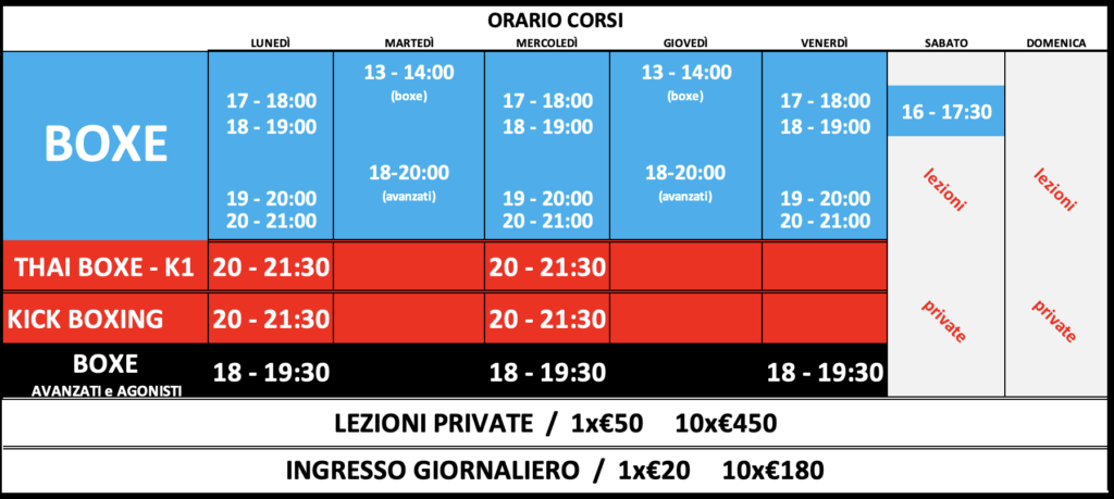 Nel nostro centro si tengono corsi di BOXE – MUAY THAI/THAI BOXE – KICKBOXING per principianti, amatori e agonisti